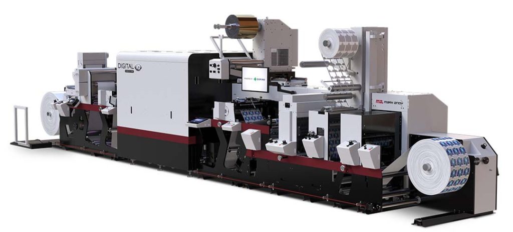 Para convertedores que buscam maior flexibilidade, as impressoras híbridas estão crescendo como uma solução estratégica. Disponíveis em uma ampla gama de configurações, os híbridos combinam os pontos fortes da impressão digital e da flexográfica simplificados em um único fluxo de trabalho. Em termos simples, uma impressora híbrida substitui as estações de cor de processo de uma impressora de etiquetas tradicional por um motor digital, mantendo todos os outros recursos de flexografia e conversão.